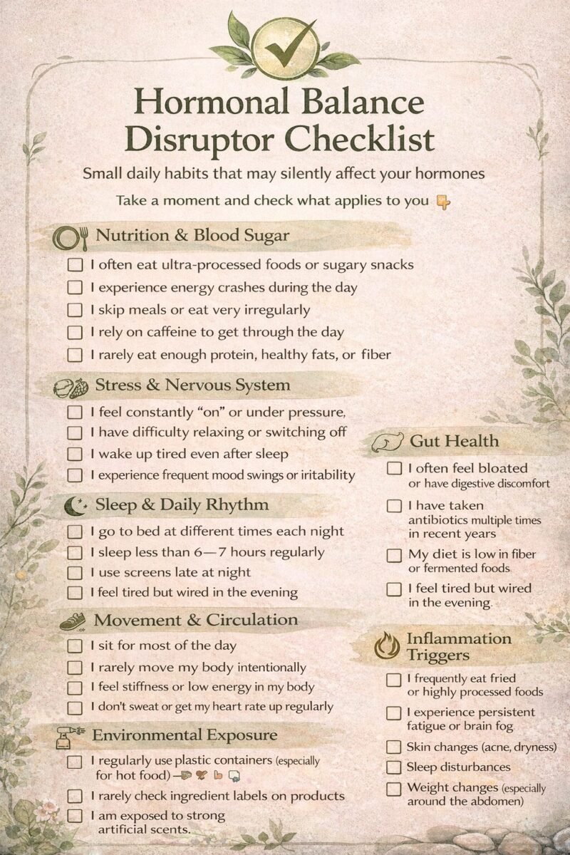 I’ve created a simple Hormonal Balance Disruptor Checklist to help you recognize possible triggers in your daily life.